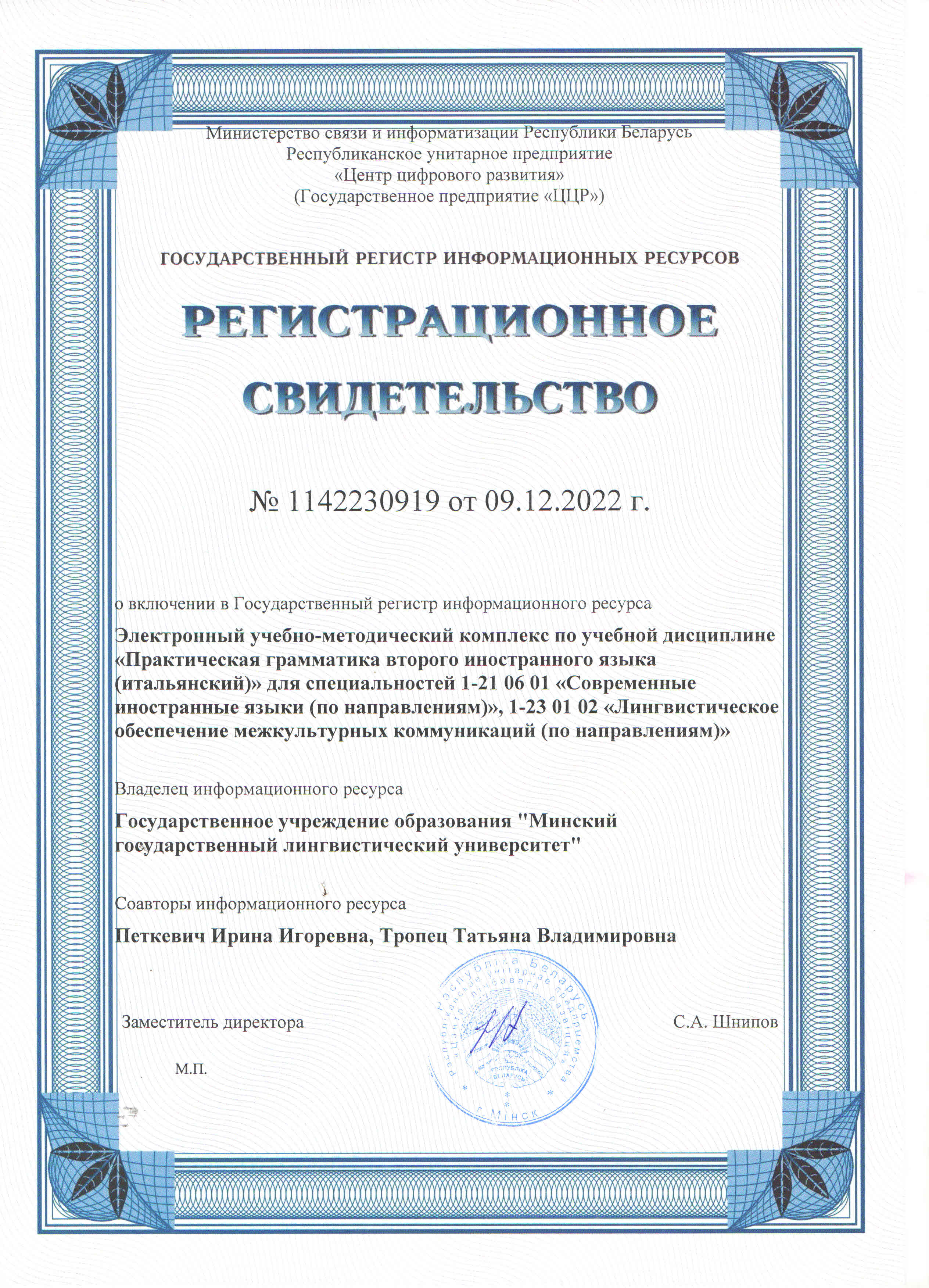 Библиографическое описание: Электронный учебно-методический комплекс по учебной дисциплине «Практическая грамматика второго иностранного языка (итальянский)» [Электронный ресурс] : для специальности 1-21 06 01 «Современные иностранные языки (по направлениям)» и 1-23 01 02 «Лингвистическое обеспечение межкультурных коммуникаций (по направлениям)» / сост.: И. И. Петкевич, Т. В. Тропец ; Минский гос. лингвист. ун-т. - Минск : МГЛУ, 2022. - Режим доступа: http://e-lib.mslu.by/handle/edoc/11725