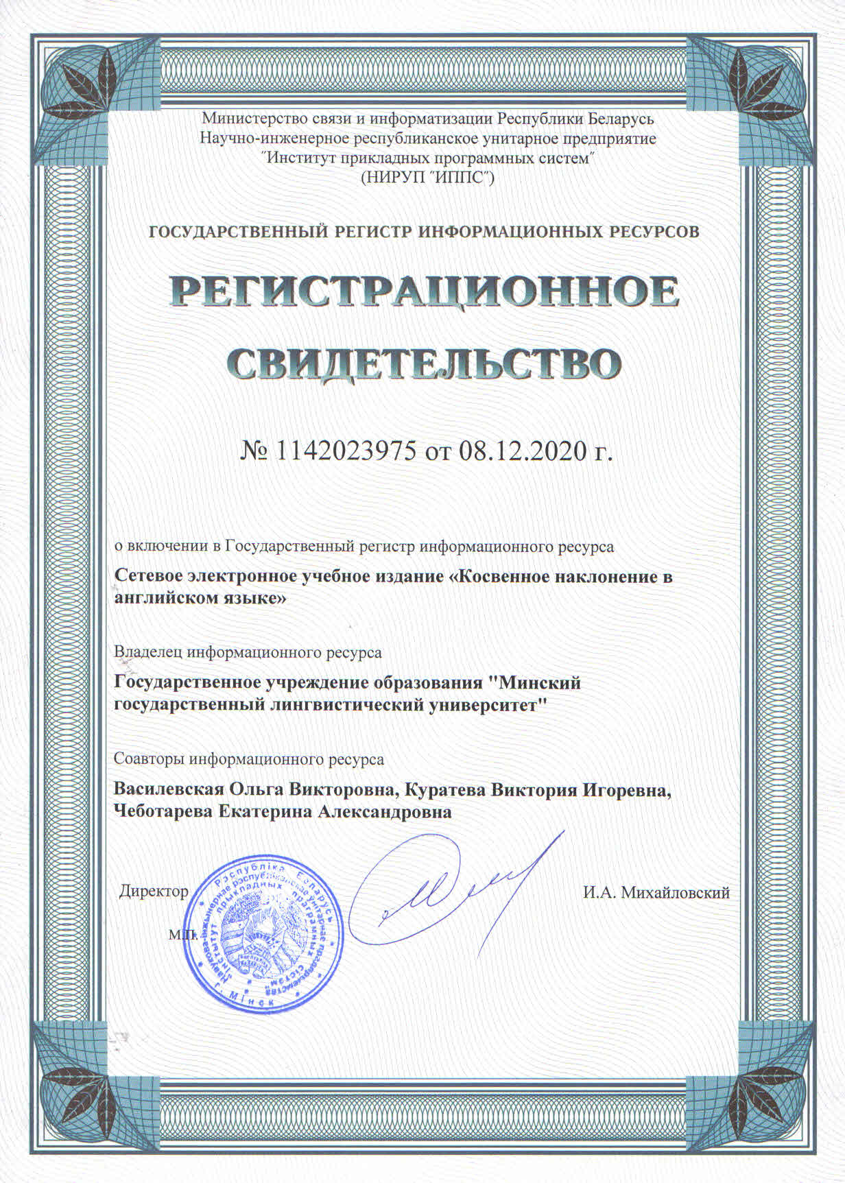 Библиографическое описание: | Василевская, О. В. Косвенное наклонение = Oblique Moods in English : практикум / О. В. Вапсилевская, В. И. Куратёва, Е. А. Чеботарёва; Минский гос. лингвист. ун-т. - Минск, МГЛУ, 2020. - Режим доступа : http://elearning.mslu.by/assignments/118/ |