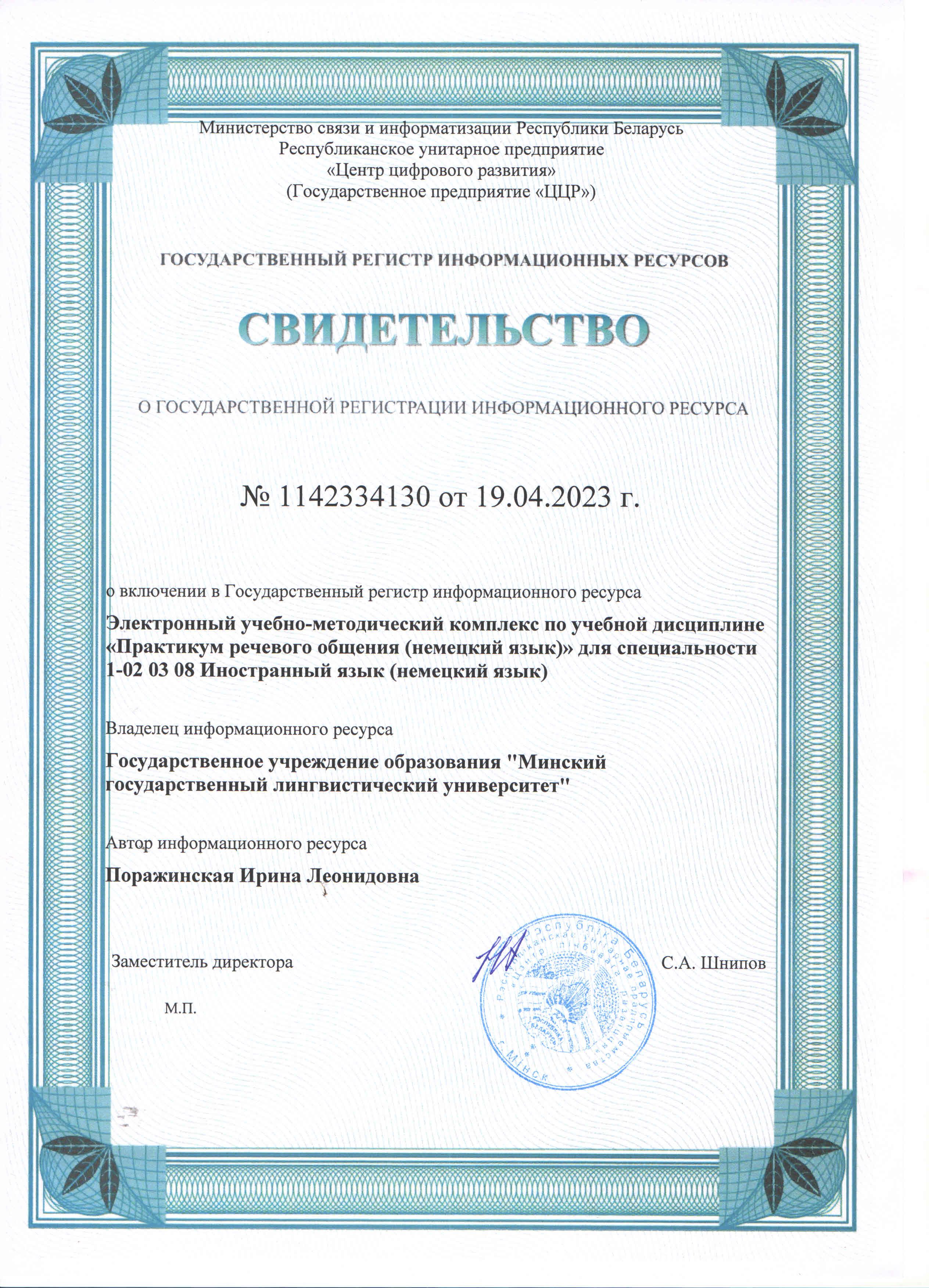 Библиографическое описание: Электронный учебно-методический комплекс по учебной дисциплине «Практикум речевого общения (немецкий язык)» для специальности 1-02 03 08 Иностранный язык (немецкий язык) / сост. И. Л. Поражинская ; Минский гос. лингвист. ун-т. – Минск, 2023. – Режим доступа: http://e-lib.mslu.by/handle/edoc/12321.