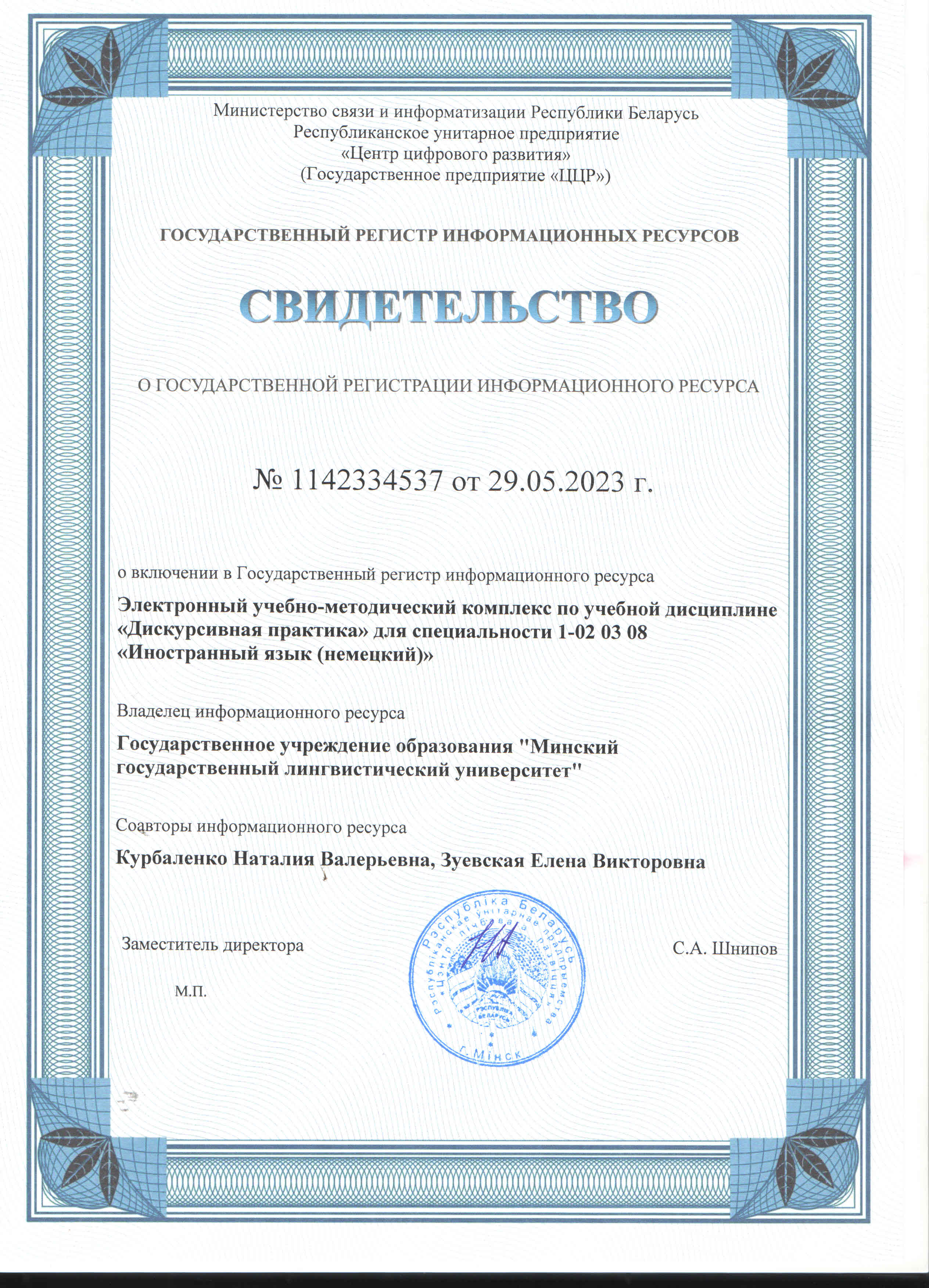 Библиографическое описание: Электронный учебно-методический комплекс по учебной дисциплине «Дискурсивная практика» для специальности 1-02 03 08 «Иностранный язык (немецкий)» / сост.: Н. В. Курбаленко, Е. В. Зуевская ; Минский гос. лингвист. ун-т. – Минск, 2023. – Режим доступа: http://e-lib.mslu.by/handle/edoc/12608.