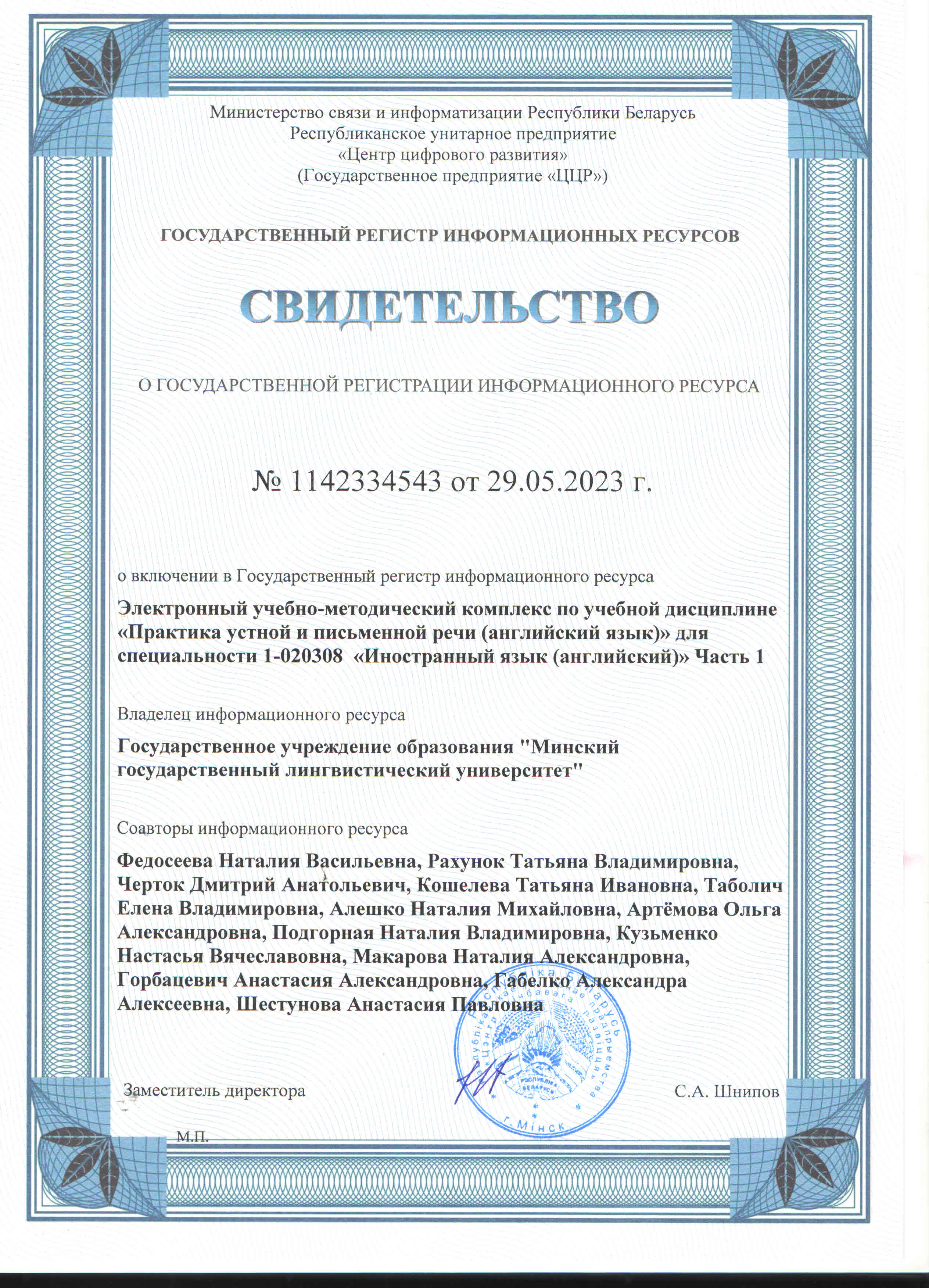 Библиографическое описание: Электронный учебно-методический комплекс по учебной дисциплине «Практика устной и письменной речи (английский язык)» для специальности 1-020308 «Иностранный язык (английский)» : в 2 ч. Ч. 1 / сост.: Н. В. Федосеева [и др.] ; Минский гос. лингвист. ун-т. – Минск, 2023. – Режим доступа: http://e-lib.mslu.by/handle/edoc/12621.