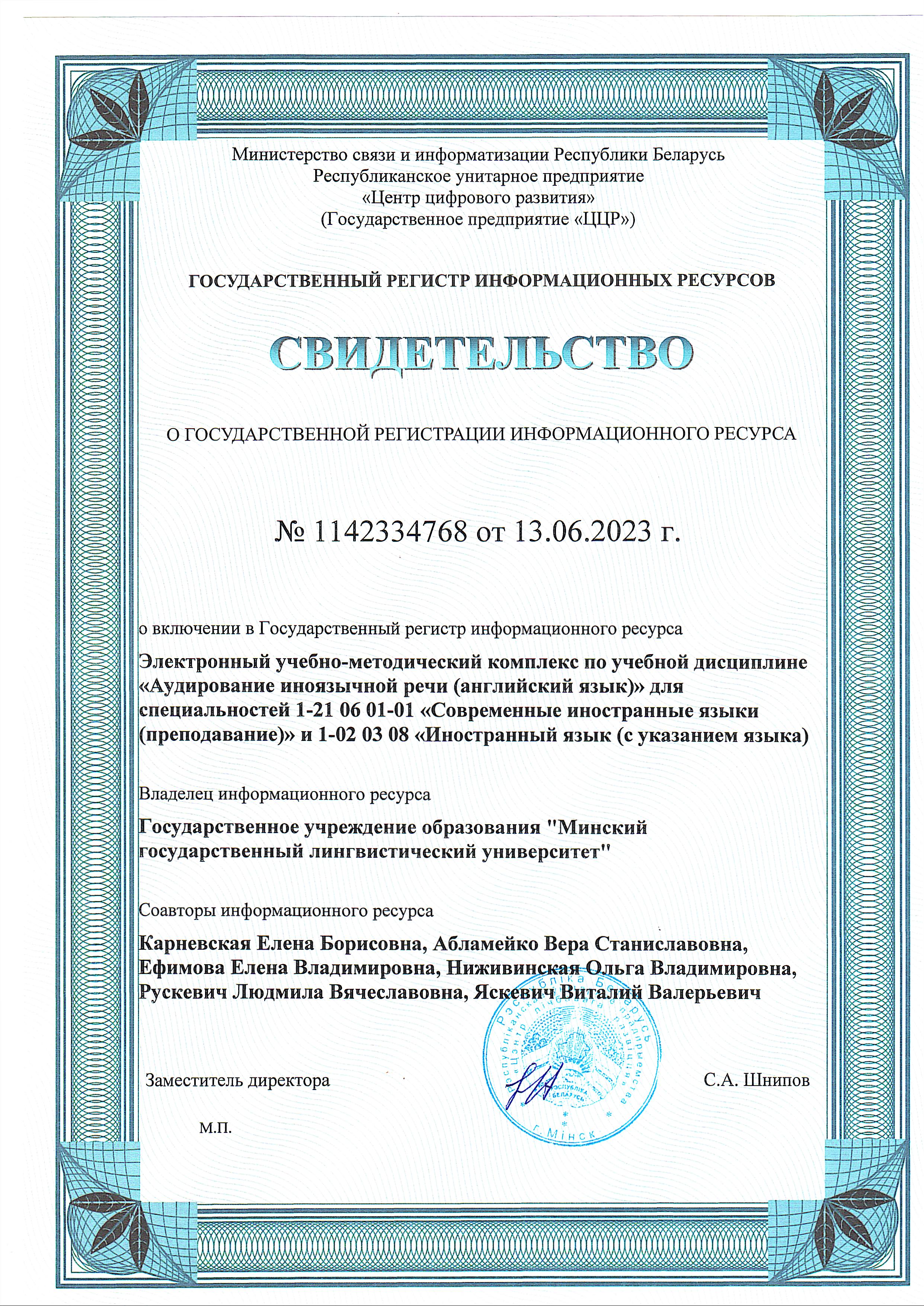 Библиографическое описание: Электронный учебно-методический комплекс по учебной дисциплине «Аудирование иноязычной речи (английский язык)» для специальностей 1-21 06 01-01 «Современные иностранные языки (преподавание)» и 1-02 03 08 «Иностранный язык (с указанием языка) / сост.: Е. В. Карневская [и др.] ; Минский гос. лингвист. ун-т. – Минск, 2023. – Режим доступа: http://e-lib.mslu.by/handle/edoc/12717.