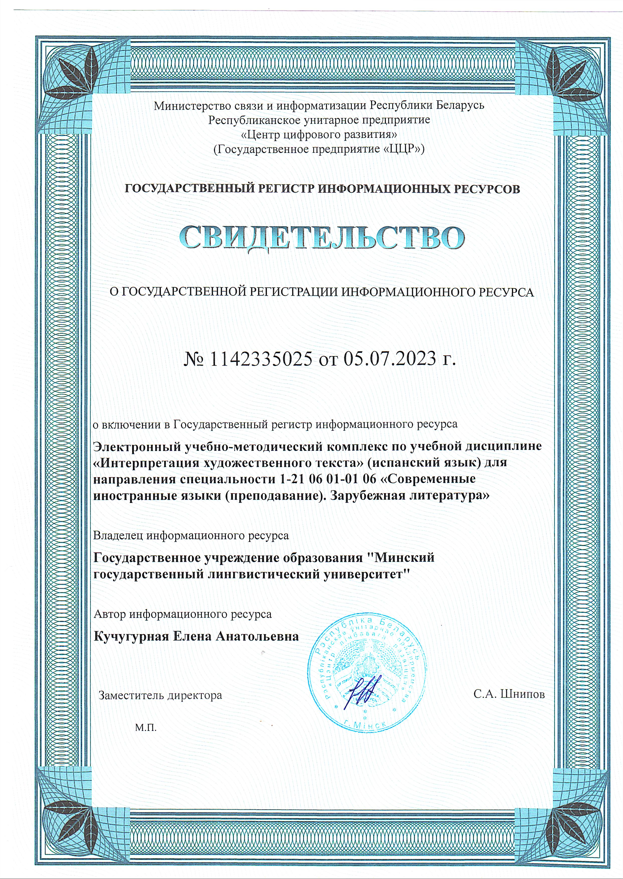Библиографическое описание: Электронный учебно-методический комплекс по учебной дисциплине «Интерпретация художественного текста» (испанский язык) для направления специальности 1-21 06 01-01 06 «Современные иностранные языки (преподавание). Зарубежная литература» / сост. Е. А. Кучугурная ; Минский гос. лингвист. ун-т. – Минск, 2023. – Режим доступа: http://e-lib.mslu.by/handle/edoc/12728.