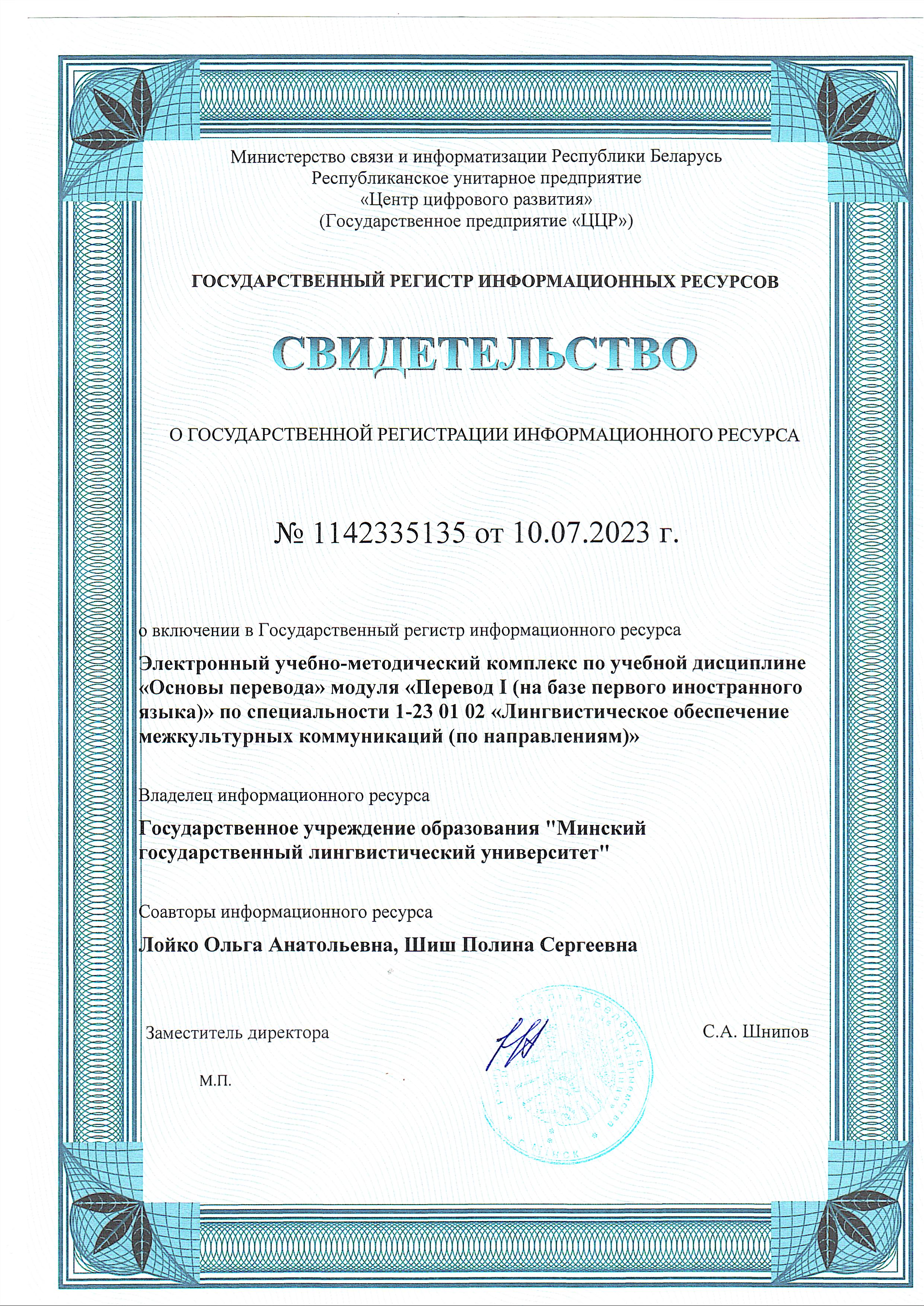 Библиографическое описание: | Электронный учебно-методический комплекс по учебной дисциплине «Основы перевода» модуля «Перевод I (на базе первого иностранного языка)» по специальности 1-23 01 02 «Лингвистическое обеспечение межкультурных коммуникаций (по направлениям)» / сост.: О. А. Лойко, П. С. Шиш ; Минский гос. лингвист. ун-т. – Минск, 2023. – Режим доступа: http://e-lib.mslu.by/handle/edoc/12738. |