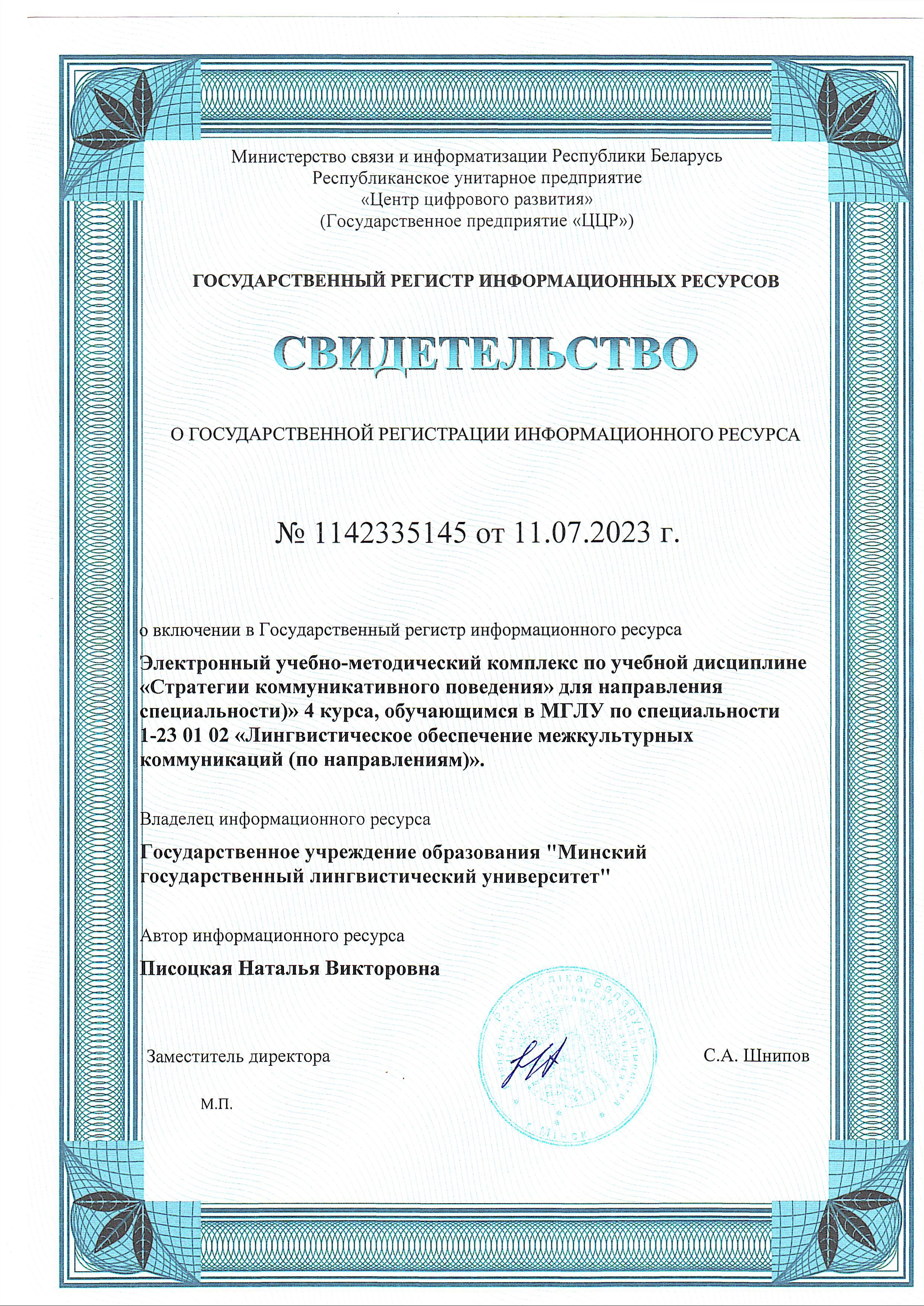 Библиографическое описание: Электронный учебно-методический комплекс по учебной дисциплине «Стратегии коммуникативного поведения» для студентов 4 курса, обучающихся по специальности 1-23 01 02 «Лингвистическое обеспечение межкультурных коммуникаций (по направлениям)» / сост. Н. В. Писоцкая ; Минский гос. лингвист. ун-т. – Минск, 2023. – Режим доступа: http://e-lib.mslu.by/handle/edoc/12742.
