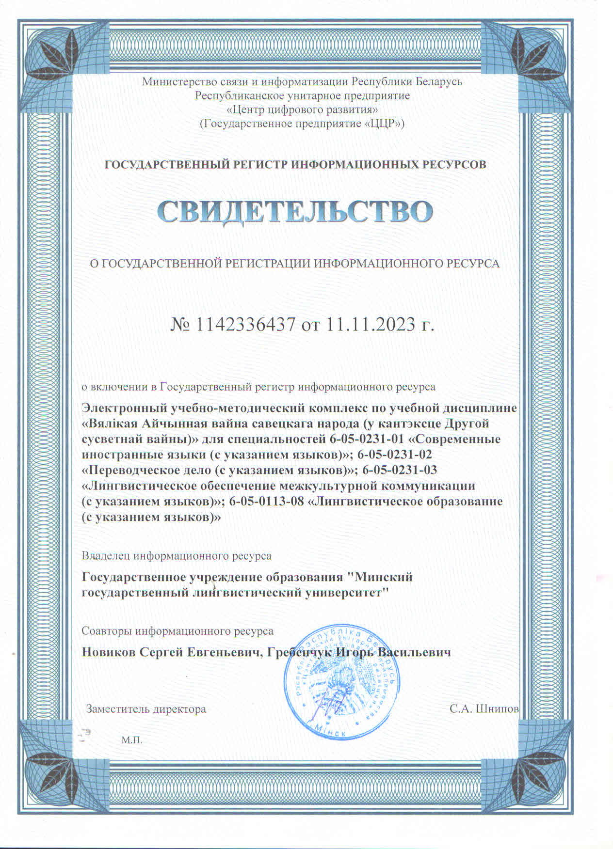 Библиографическое описание: | Электронный учебно-методический комплекс по учебной дисциплине «Вялікая Айчынная вайна савецкага народа (у кантэксце Другой сусветнай вайны)» для специальностей 6-05-0231-01 «Современные иностранные языки (с указанием языков)»; 6-05-0231-02 «Переводческое дело (с указанием языков)»; 6-05-0231-03 «Лингвистическое обеспечение межкультурной коммуникации (с указанием языков)»; 6-05-0113-08 «Лингвистическое образование (с указанием языков)» / сост.: С. Е. Новиков, И. В. Гребенчук; Минский гос. лингвист. ун-т. – Минск, 2023. – Режим доступа: http://e-lib.mslu.by/handle/edoc/13237. |