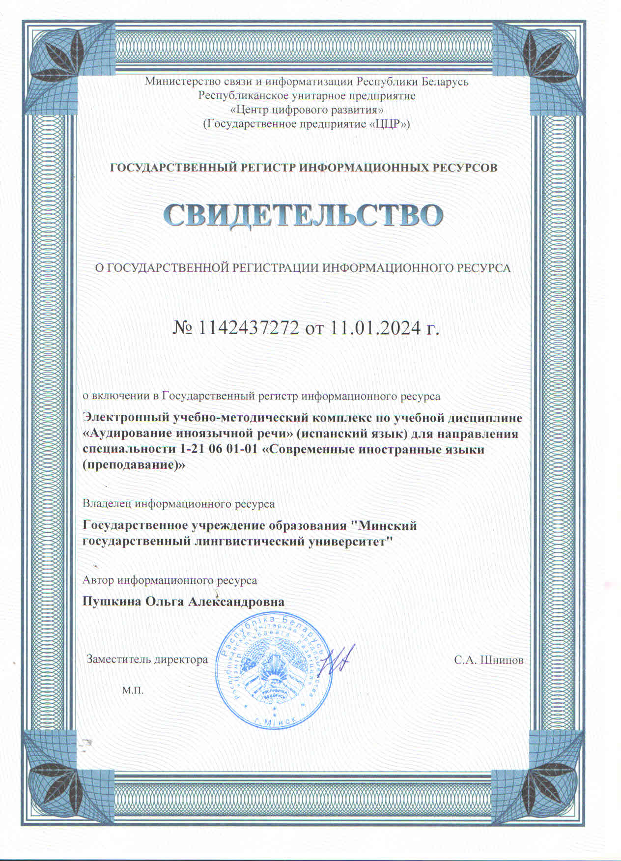 Библиографическое описание: Электронный учебно-методический комплекс по учебной дисциплине «Аудирование иноязычной речи» (испанский язык) для направления специальности 1-21 06 01-01 «Современные иностранные языки (преподавание)» / сост.: О. А. Пушкина ; Минский гос. лингвист. ун-т. – Минск, 2023. – Режим доступа: http://e-lib.mslu.by/handle/edoc/14002.