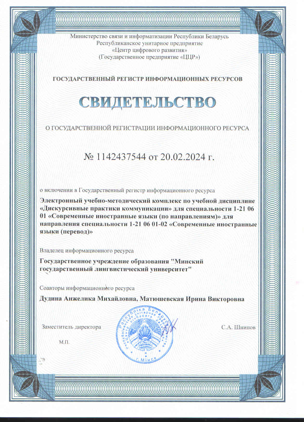 Библиографическое описание: Электронный учебно-методический комплекс по учебной дисциплине «Дискурсивные практики коммуникации» для специальности 1-21 06 01 «Современные иностранные языки (по направлениям)» для направления специальности 1-21 06 01-02 «Современные иностранные языки (перевод)» / сост.: А. М. Дудина, И. В. Матюшевская ; Минский гос. лингвист. ун-т. – Минск, 2023. – Режим доступа: http://e-lib.mslu.by/handle/edoc/14088.