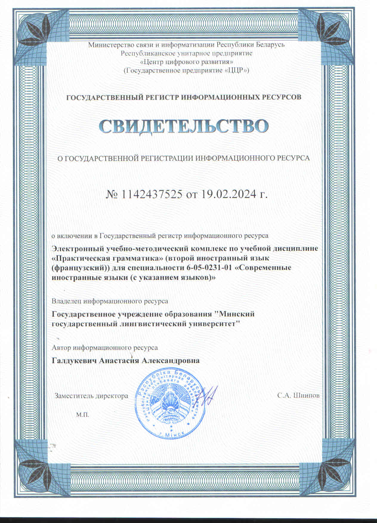 Библиографическое описание: Электронный учебно-методический комплекс по учебной дисциплине «Практическая грамматика» (второй иностранный язык (французский)) для специальности 6-05-0231-01 «Современные иностранные языки (с указанием языков)» / сост.: А. А. Галдукевич ; Минский гос. лингвист. ун-т. – Минск, 2023. – Режим доступа: http://e-lib.mslu.by/handle/edoc/14089.
