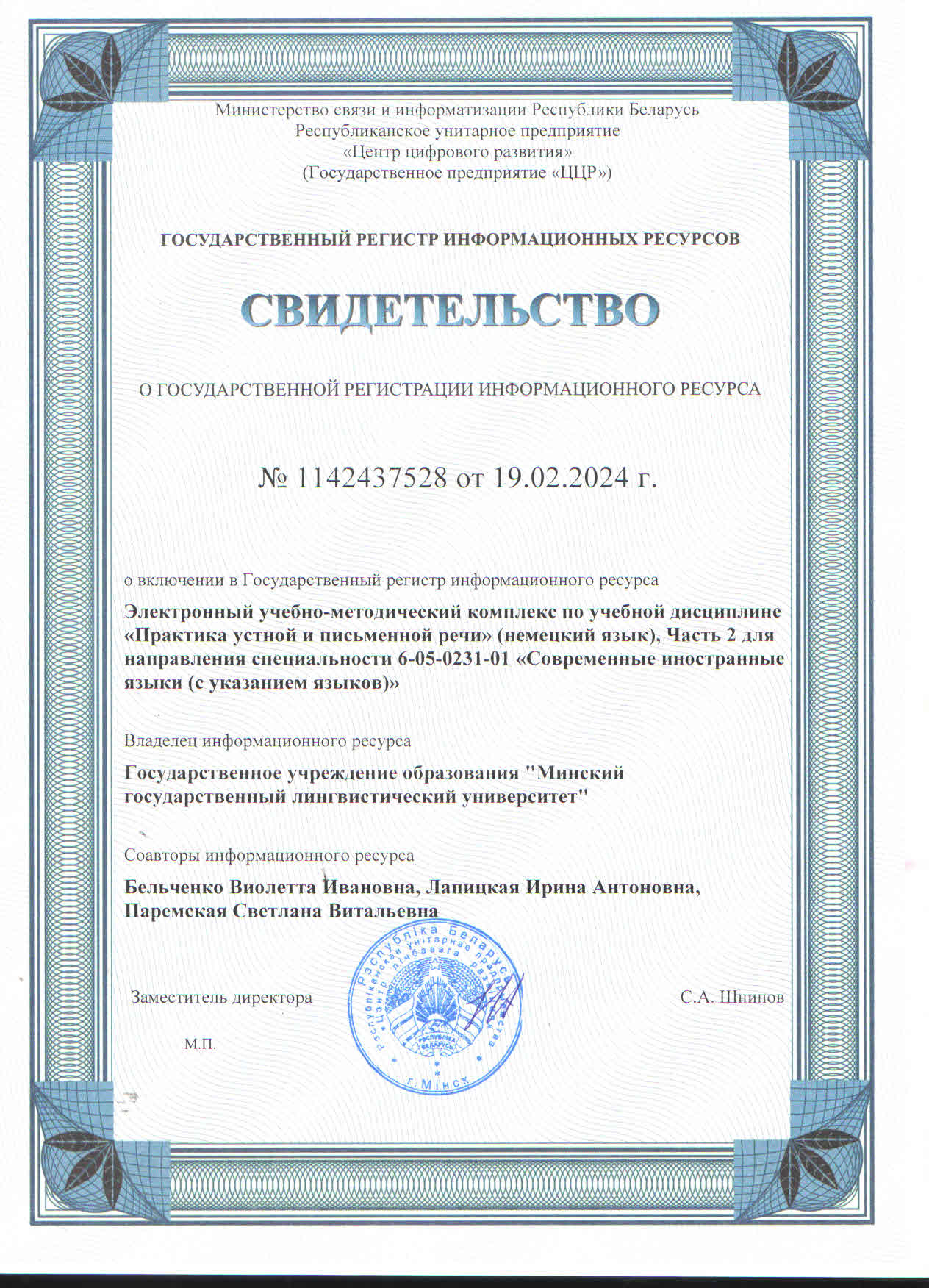 Библиографическое описание: | Электронный учебно-методический комплекс по учебной дисциплине «Практика устной и письменной речи» (немецкий язык) Ч. 2 для направления специальности 6-05-0231-01 «Современные иностранные языки (с указанием языков)» / сост.: В. И. Бельченко, И. А. Лапицкая, С. В. Паремская ; Минский гос. лингвист. ун-т. – Минск, 2023. – Режим доступа: http://e-lib.mslu.by/handle/edoc/14095. |