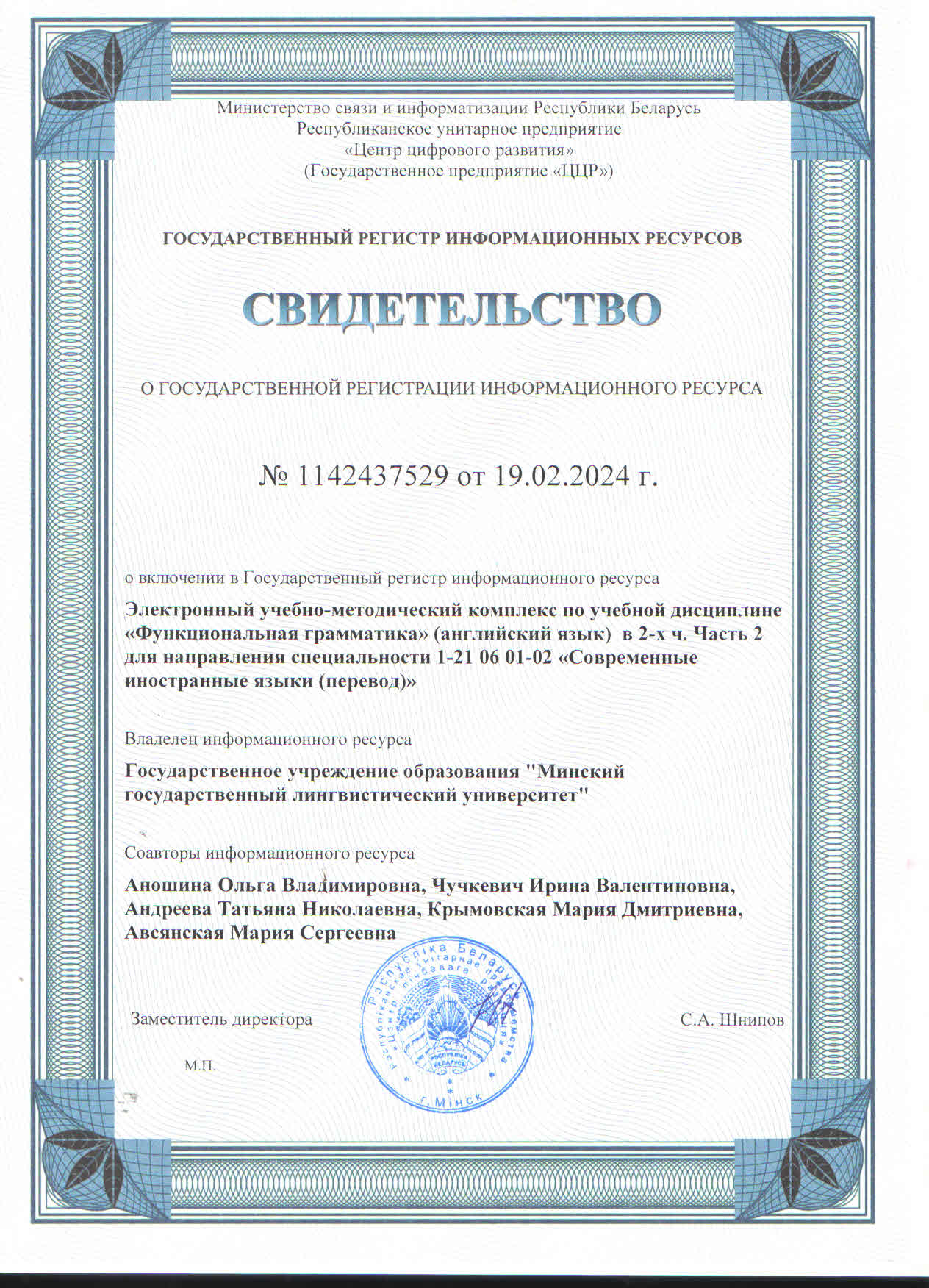 Библиографическое описание: Электронный учебно-методический комплекс по учебной дисциплине «Функциональная грамматика» (английский язык) в 2-х ч. Часть 2 для направления специальности 1-21 06 01-02 «Современные иностранные языки (перевод)»/ сост.: О. В. Аношина [и др.] ; Минский гос. лингвист. ун-т. – Минск, 2023– Режим доступа: http://e-lib.mslu.by/handle/edoc/14096.