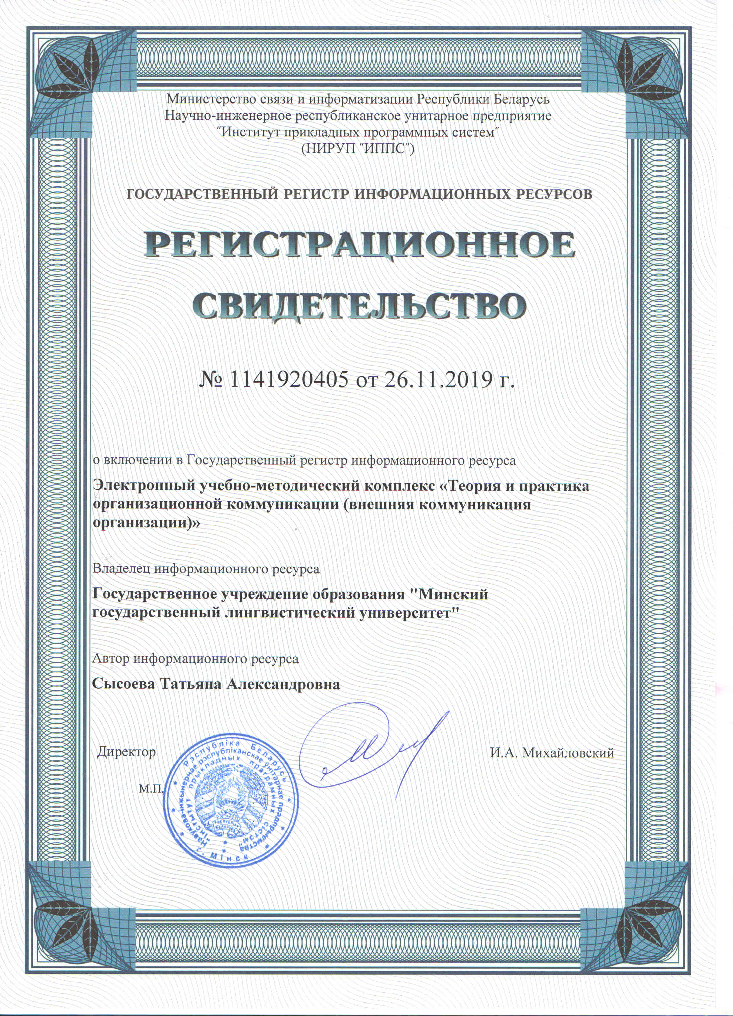 Библиографическое описание: Электронный учебно-методический комплекс "Теория и практика организационной коммуникации: внешняя коммуникация организации" [Электронный ресурс] : для магистрантов, обучающихся по специальности 1-23 80 09 «Лингвистическое обеспечение межкультурной коммуникации (с указанием языков)», профилизация «Коммуникативный менеджмент» / Т. А. Сысоева ; Минский гос. лингвист. ун-т. - Электрон. дан. (3,7 Mb). - Минск : МГЛУ, 2019. - Режим доступа: http://elearning.mslu.by/assignments/109/