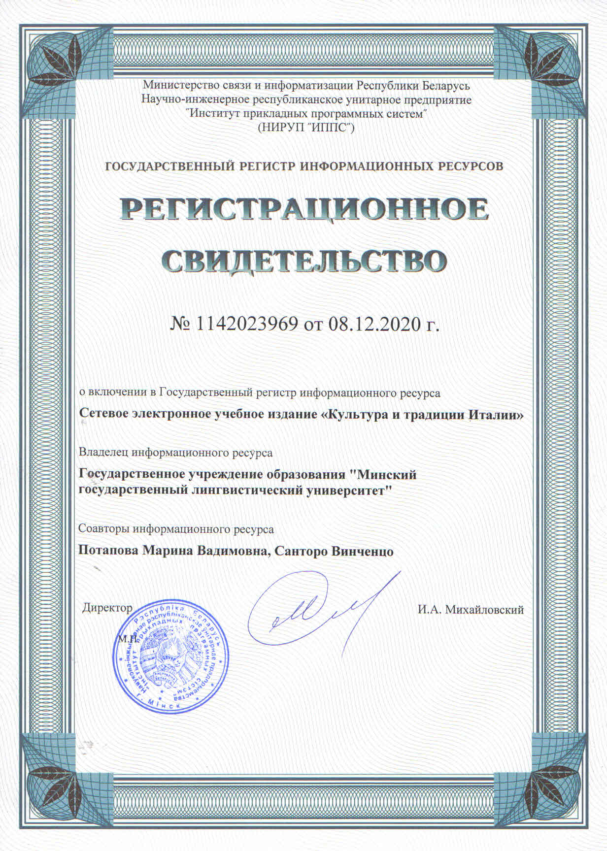 Библиографическое описание: Потапова, М. В. Культура и традиции Италии = Cultura e tradizioni italiane [Электронный ресурс]: сетевое электрон. учеб. изд. / М. В. Потапова, В. Санторо ; Минский гос. лингвист. ун-т. - Электрон. дан. - Минск : МГЛУ, 2020. - Режим доступа: http://e-lib.mslu.by/handle/edoc/5145