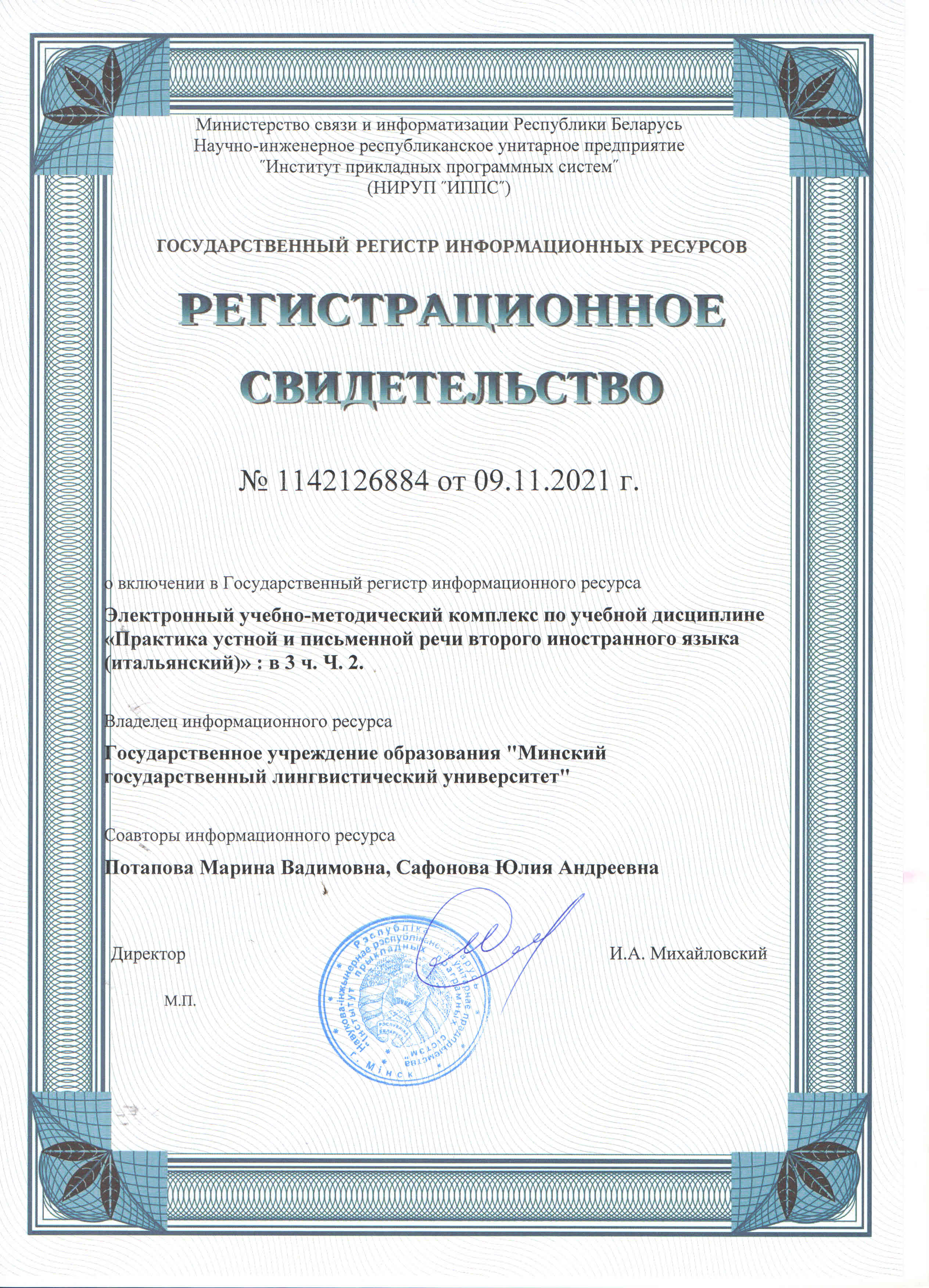 Библиографическое описание: Электронный учебно-методический комплекс по учебной дисциплине "Практика устной и письменной речи второго иностранного языка (итальянский)" [Электронный ресурс] : в 3 ч. Ч. 2 / сост.: М. В. Потапова, Ю. А. Сафонова ; рец.: Е. А. Булат ; Минский гос. лингвист. ун-т. - Минск : МГЛУ, 2021. - 259 с. - Режим доступа: http://e-lib.mslu.by/handle/edoc/7326