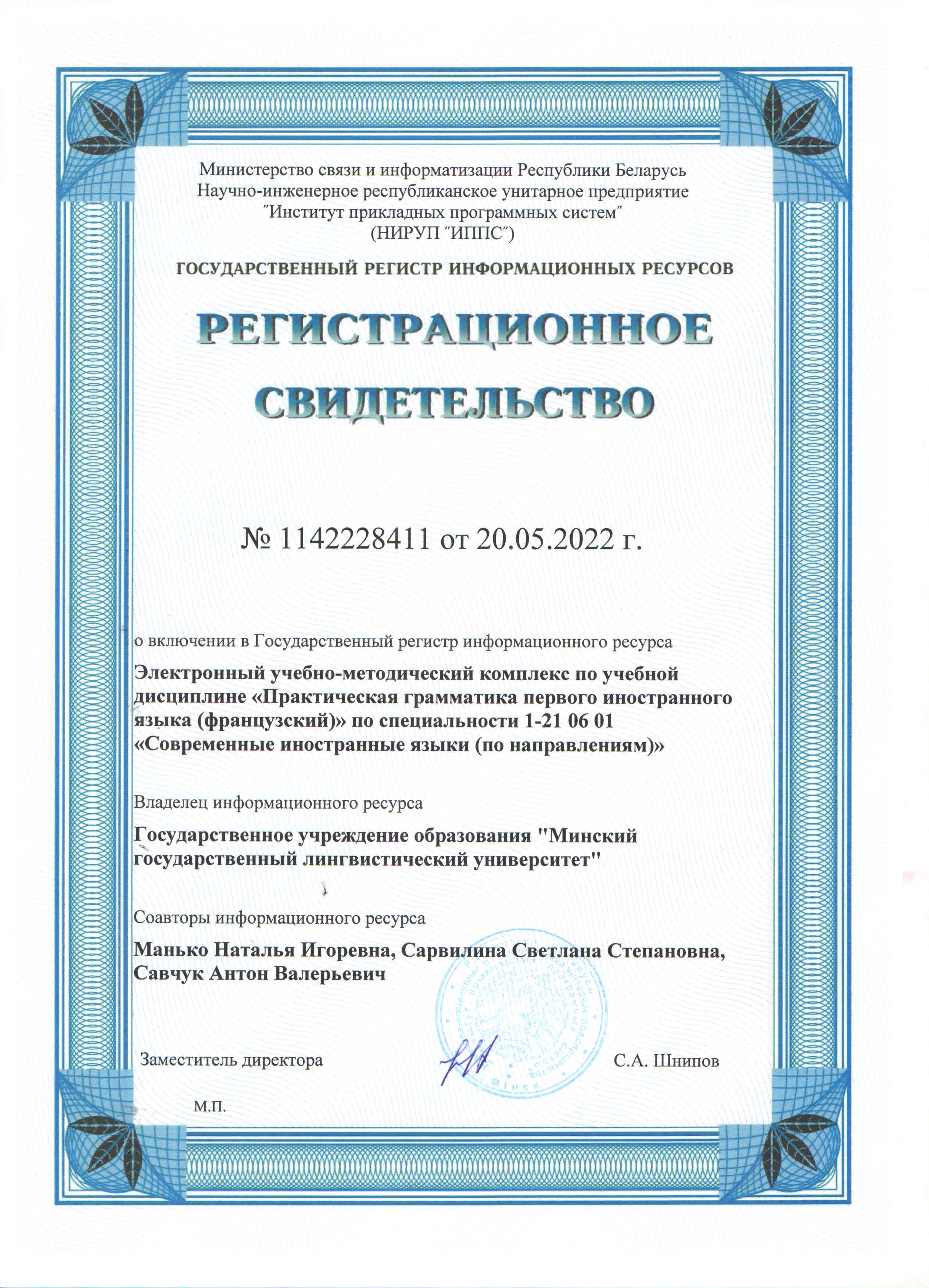 Библиографическое описание: Электронный учебно-методический комплекс по учебной дисциплине "Практическая грамматика первого иностранного языка (французский)" [Электронный ресурс] : для специальности 1-21 06 01 "Современные иностранные языки (по направлениям)" / сост.: Н. И. Манько, С. С. Сарвилина, А. В. Савчук ; Минский гос. лингвист. ун-т ; рец. А. А. Гаврилович. - Минск : МГЛУ, 2022. - Режим доступа: http://e-lib.mslu.by/handle/edoc/9110
