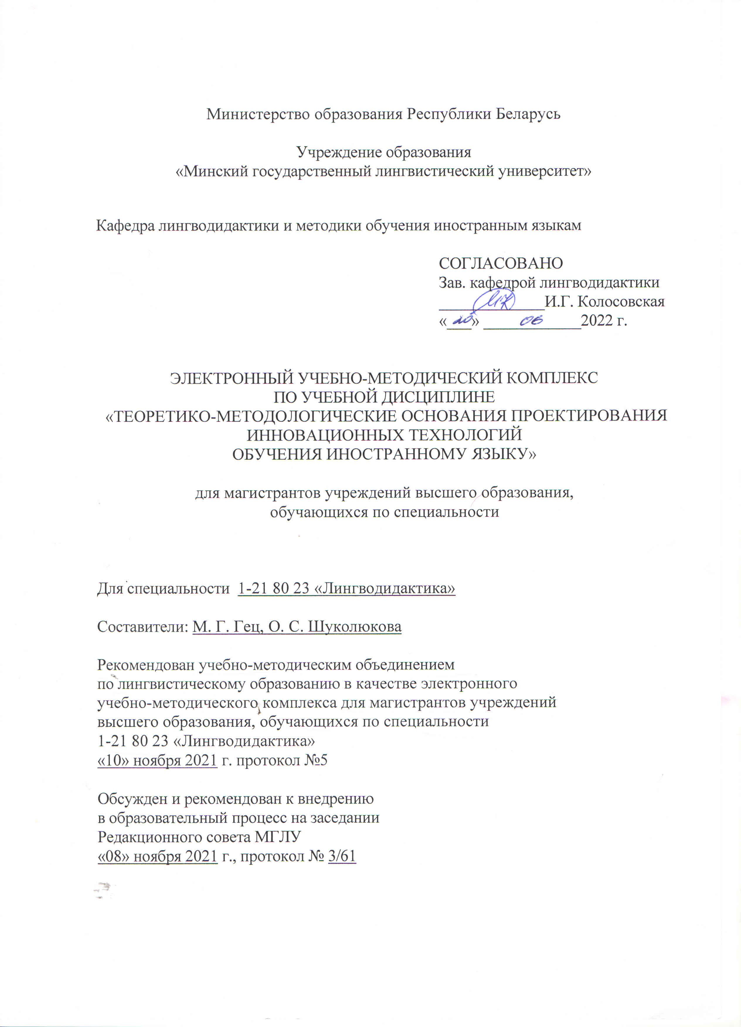Название: | Электронный учебно-методический комплекс по учебной дисциплине "Теоретико-методологические основания проектирования инновационных технологий обучения иностранному языку" |