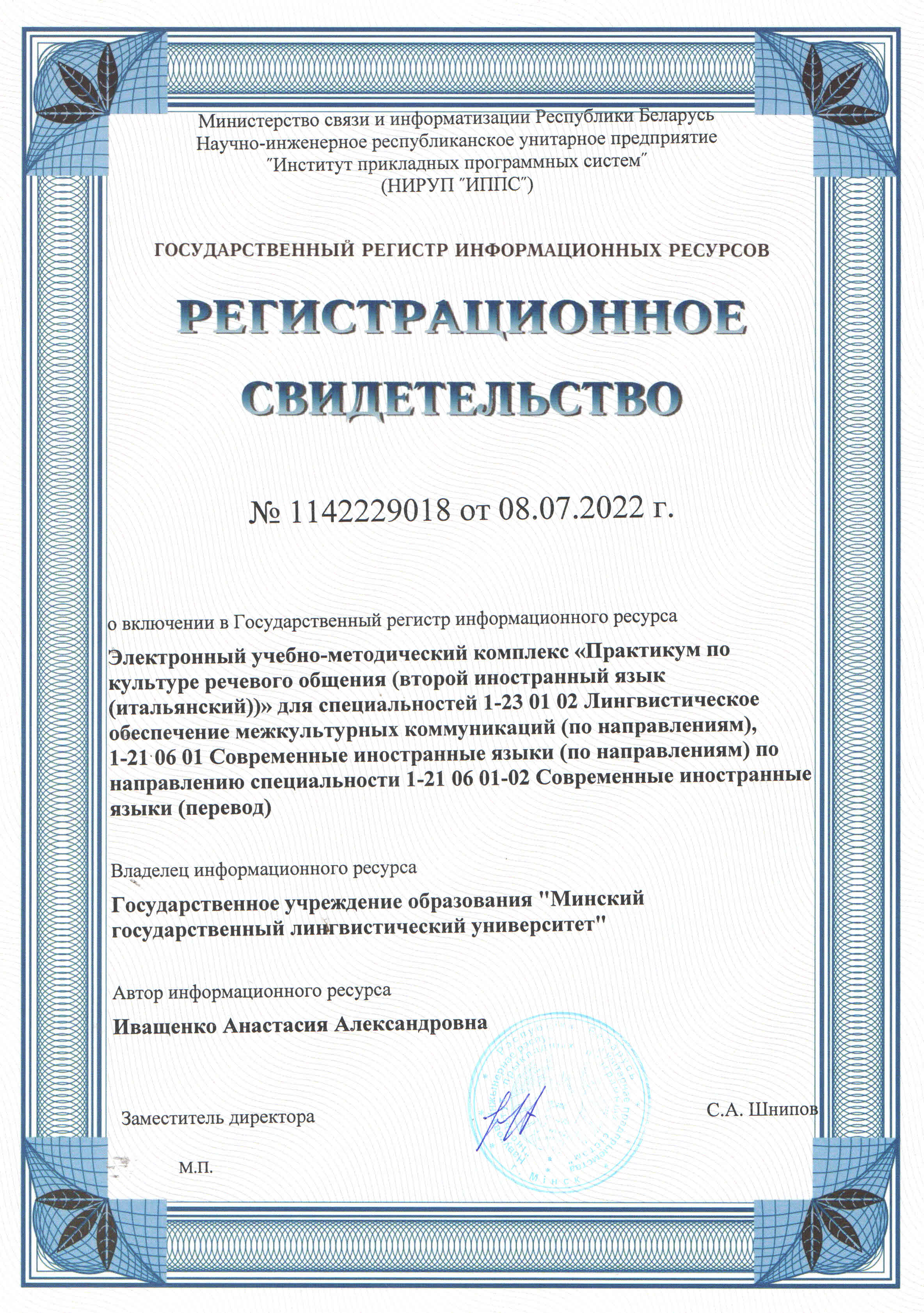 Библиографическое описание: Электронный учебно-методический комплекс по учебной дисциплине «Практикум по культуре речевого общения (второй иностранный язык (итальянский))» [Электронный ресурс] : для студентов специальности 1-23 01 02 «Лингвистическое обеспечение межкультурных коммуникации (по направлениям)» 1-21 06 01 «Современные иностранные языки (по направлениям)», 1-21 06 01-02 «Современные иностранные языки (перевод) / сост. А. А. Иващенко ; Минский гос. лингвист. ун-т. – Минск : МГЛУ, 2022. – 179 с. – Режим доступа: http://e-lib.mslu.by/handle/edoc/9233