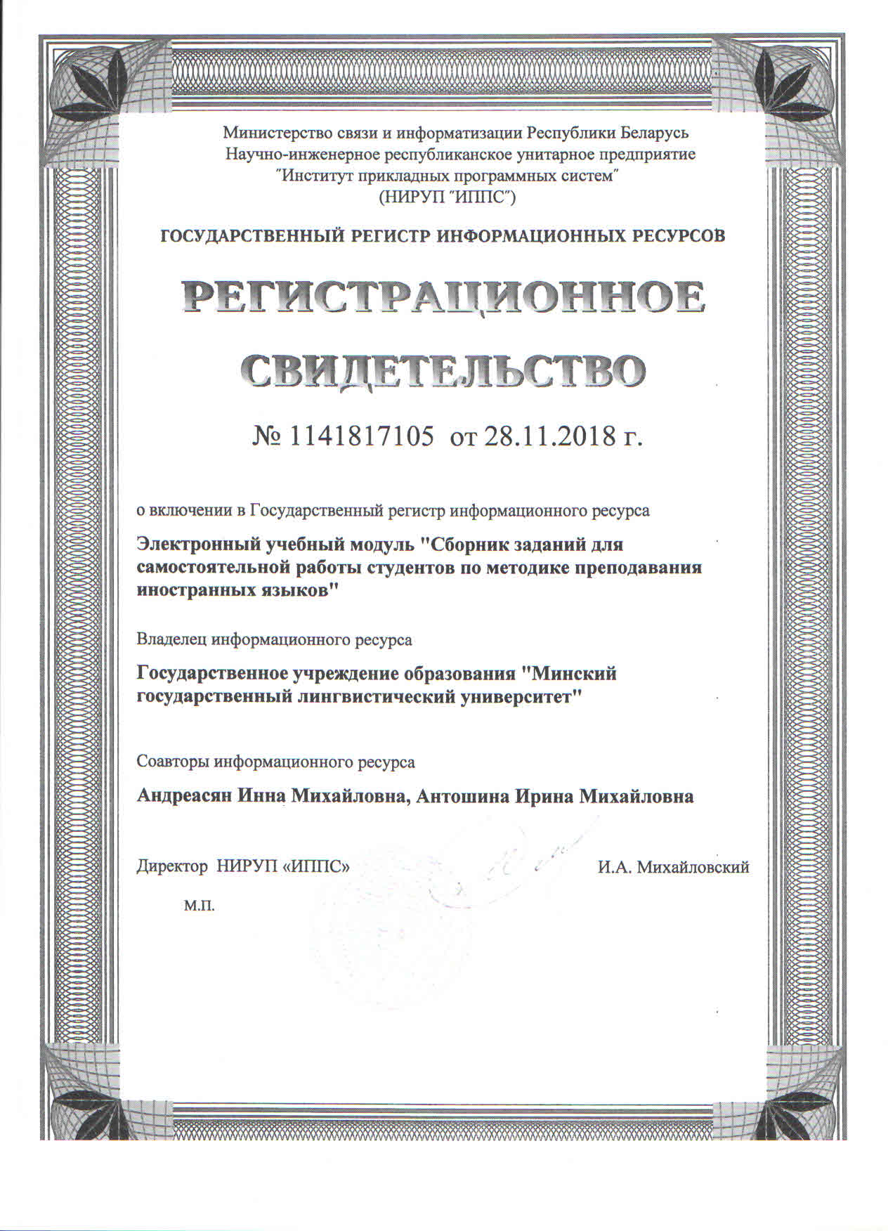 Библиографическое описание: Электронный учебный модуль "Сборник заданий для самостоятельной работы студентов по методике преподавания иностранных языков" [Электронный ресурс] : для студентов заочной формы получения высшего образования, обучающихся по специальности 1-02 03 08 «Иностранный язык (английский язык, немецкий язык)» / сост.: И. М. Андреасян, И. М. Антошина ; Минский гос. лингвист. ун-т ; рец. А. М. Леус. - Электрон. дан. (1,35 Mb).- Минск : МГЛУ, 2018. - 88 с. - Режим доступа: http://e-lib.mslu.by/handle/edoc/927.